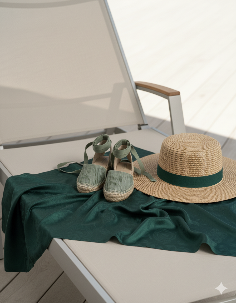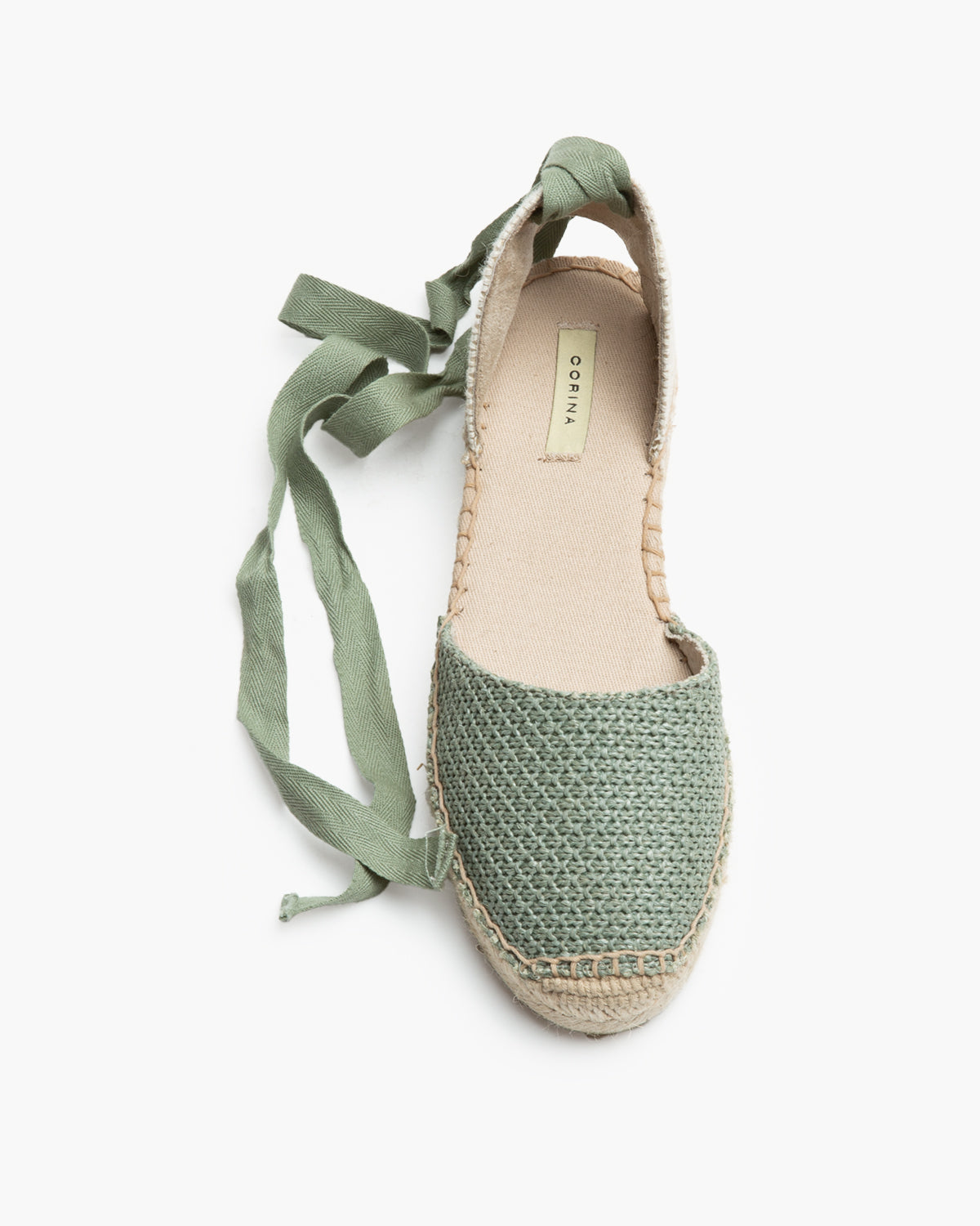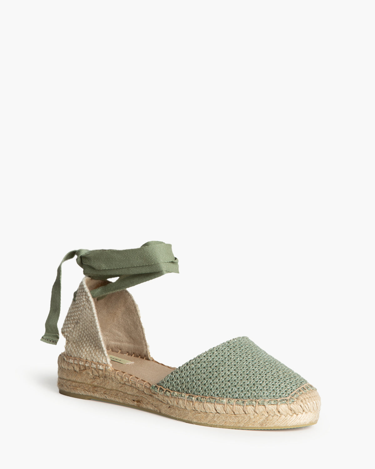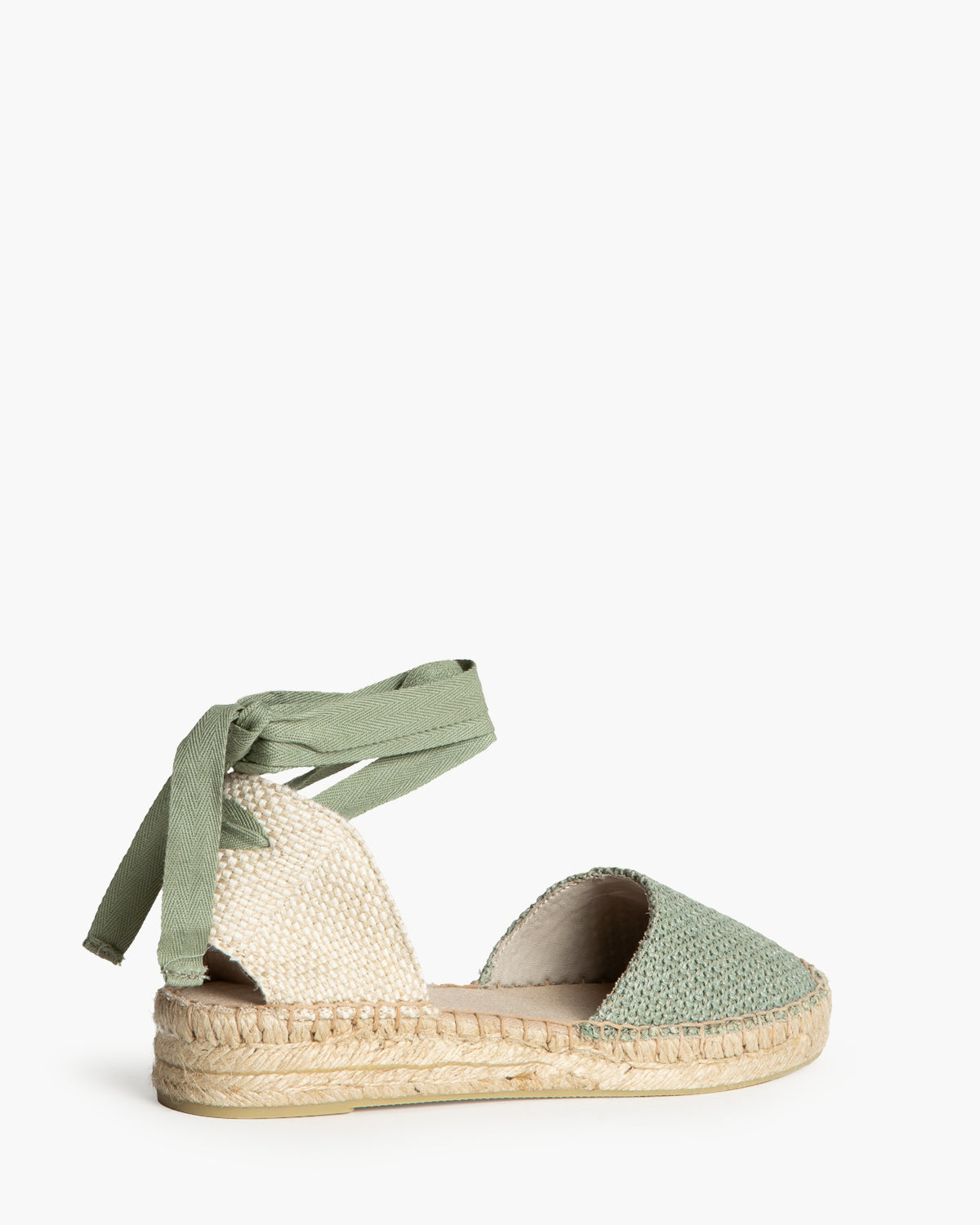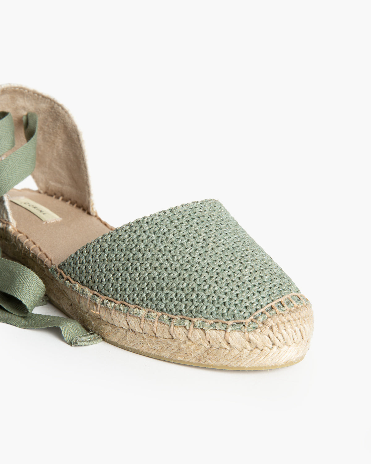 Sandalia plana tipo alpargata, con suela en yute. Cierre mediante lazo anudado al tobillo. Corte tipo ganchillo.