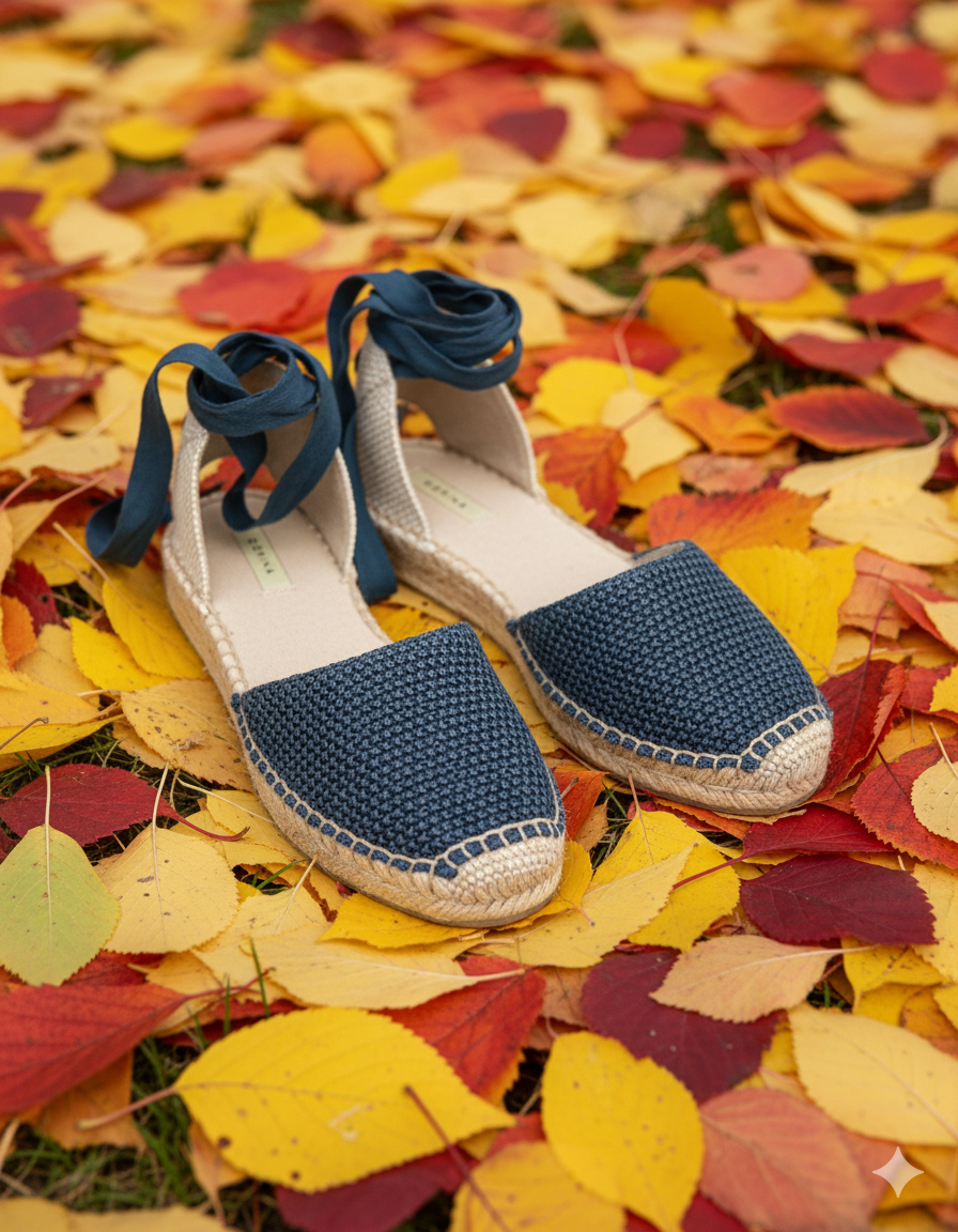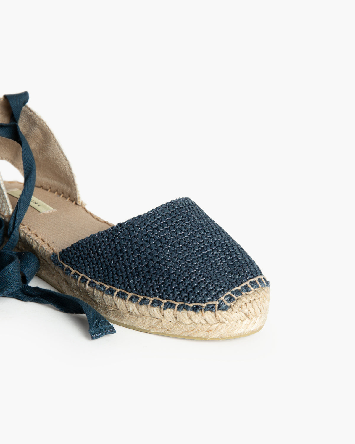 Sandalia plana tipo alpargata, con suela en yute. Cierre mediante lazo anudado al tobillo. Corte tipo ganchillo.