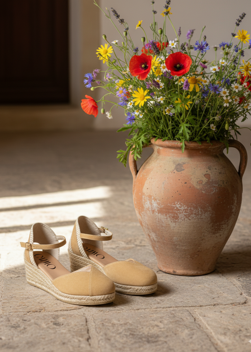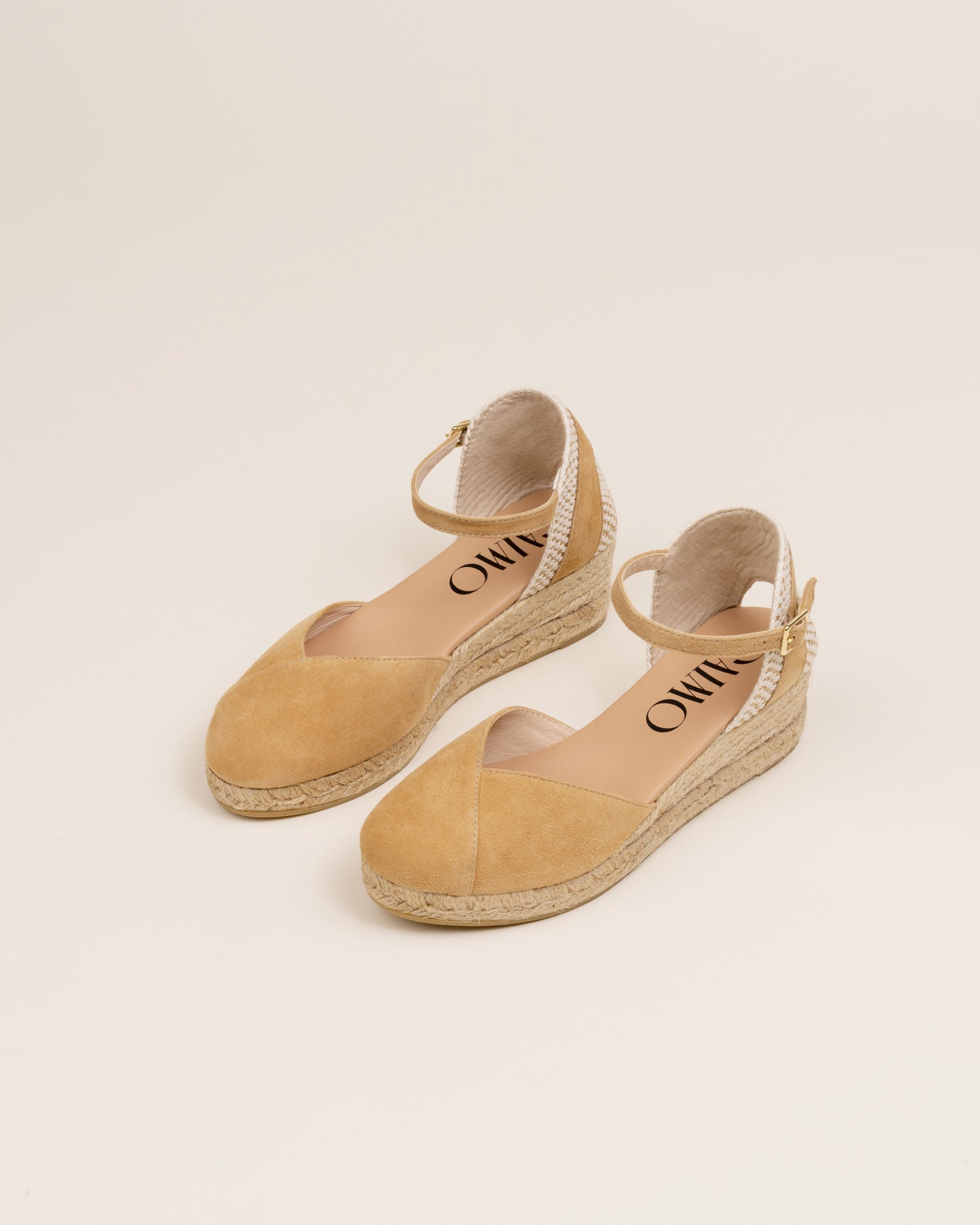 Las alpargatas Copita, confeccionadas en piel ante, presentan un diseño de corte cerrado con escote en pico y talonera con cierre de hebilla al tobillo. Con forro y plantilla de piel acolchada para un confort superior y cuña de yute ecológico, combinan estilo y sofisticación. Diseñadas y fabricadas artesanalmente.