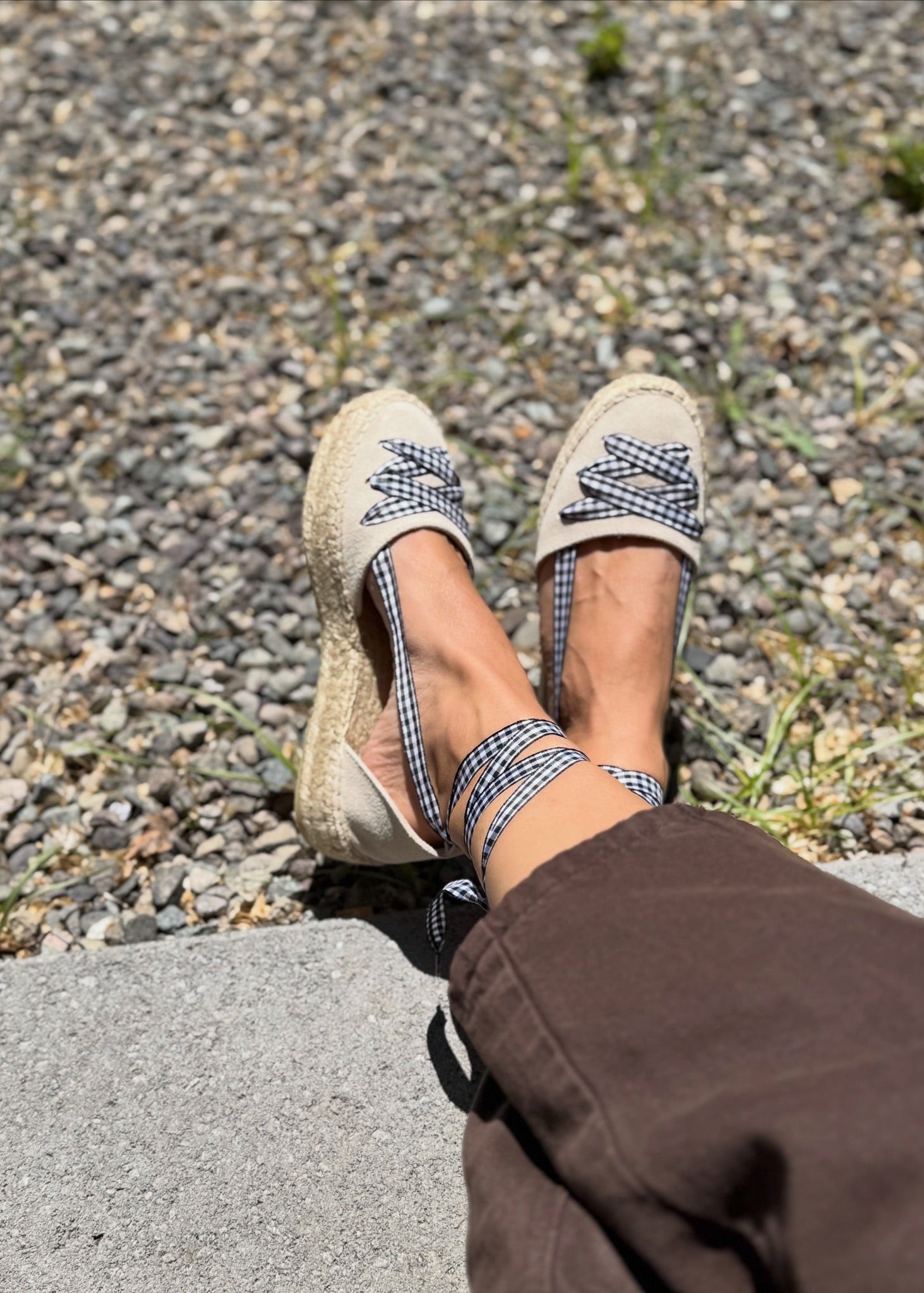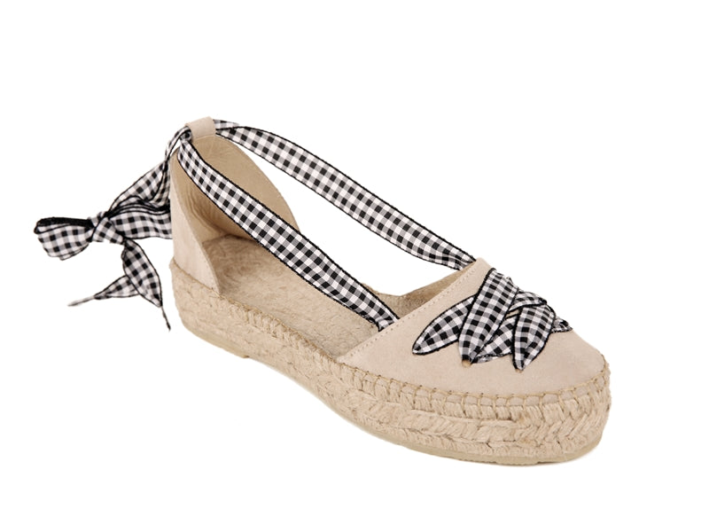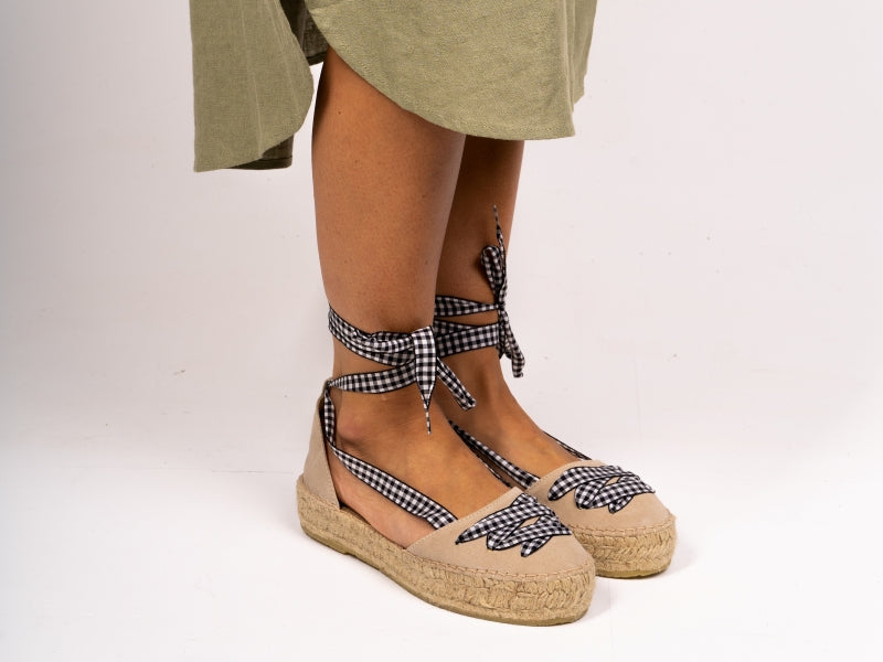 Alpargata plana color natural, de doble suela de serraje con cintas en cuadrillé para mujer.
