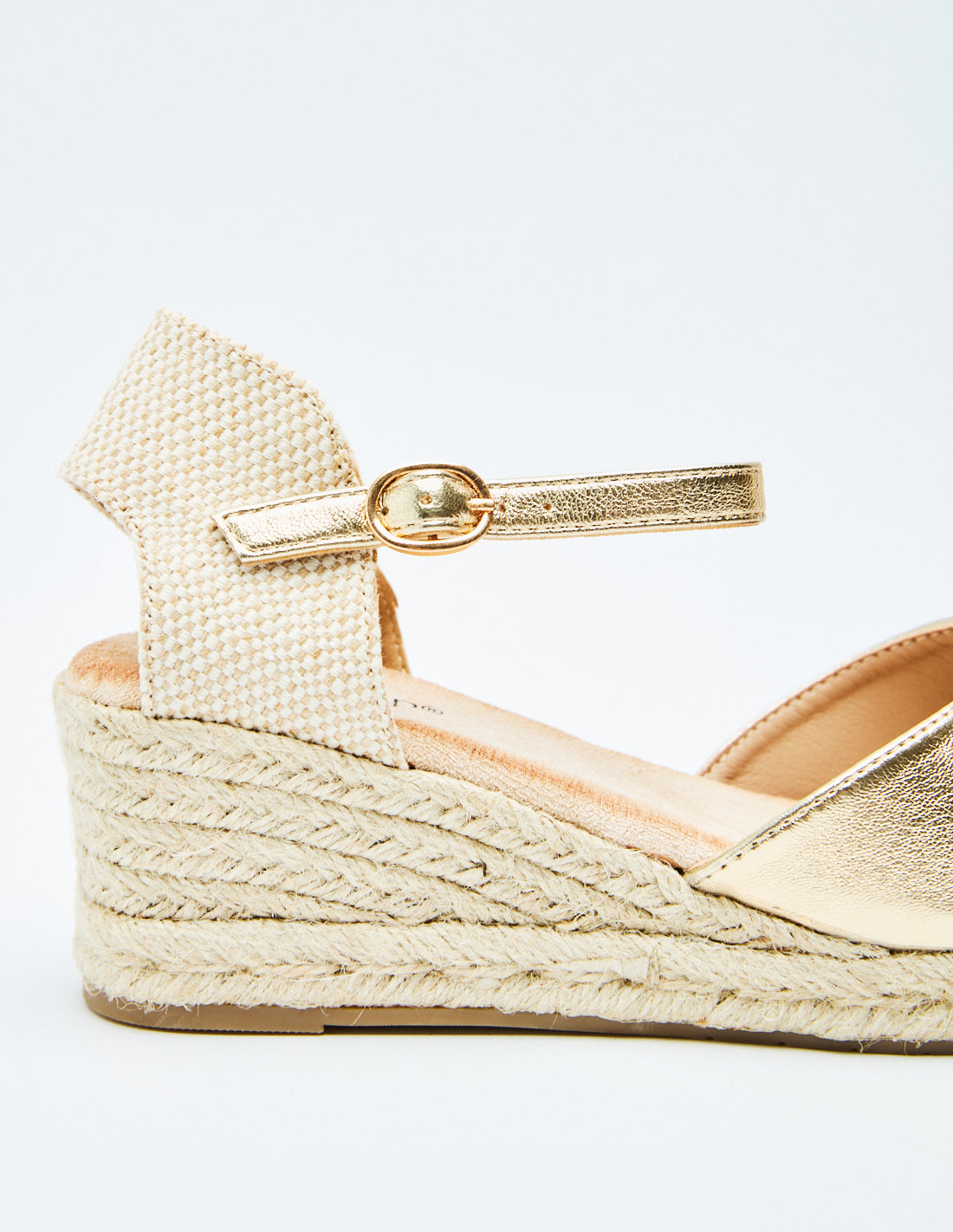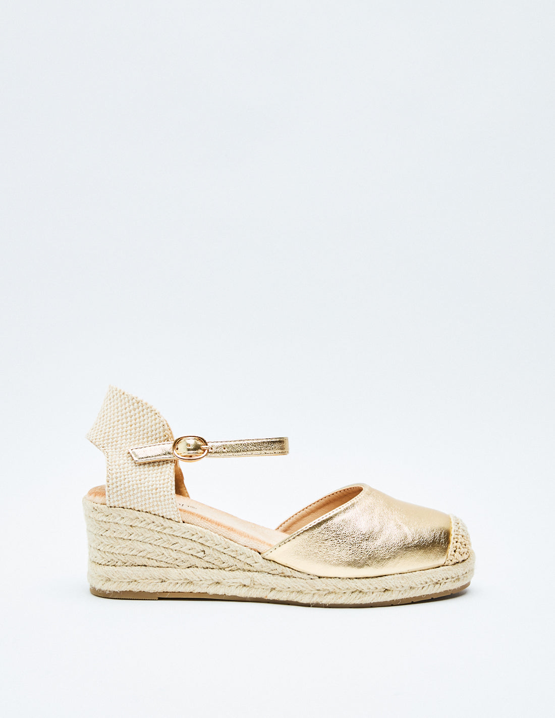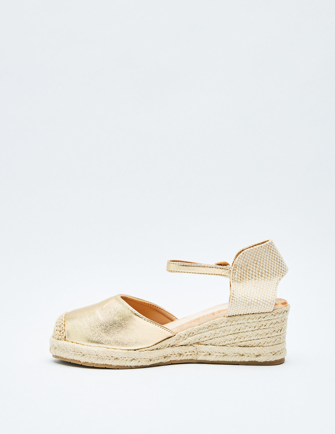 Alpargata destalonada en efecto metalizado . Tacón altura media en forma de cuña. Cierre mediante pulsera con hebilla en el tobillo. Suela de goma con yute . Altura del tacón: 6.8 cm