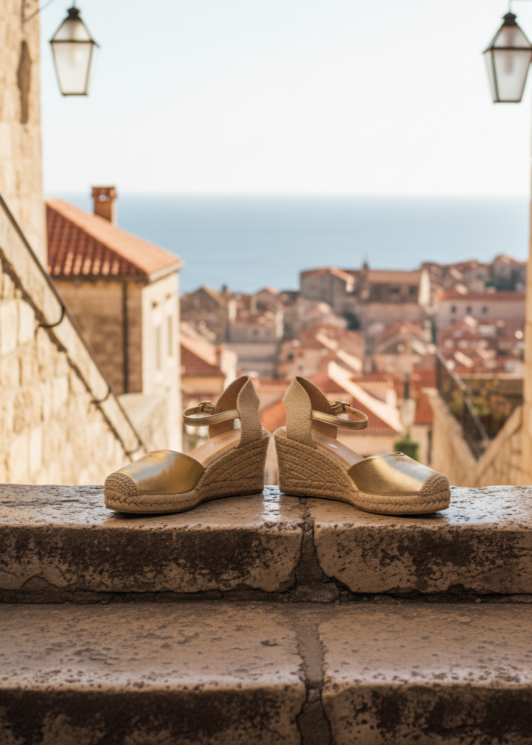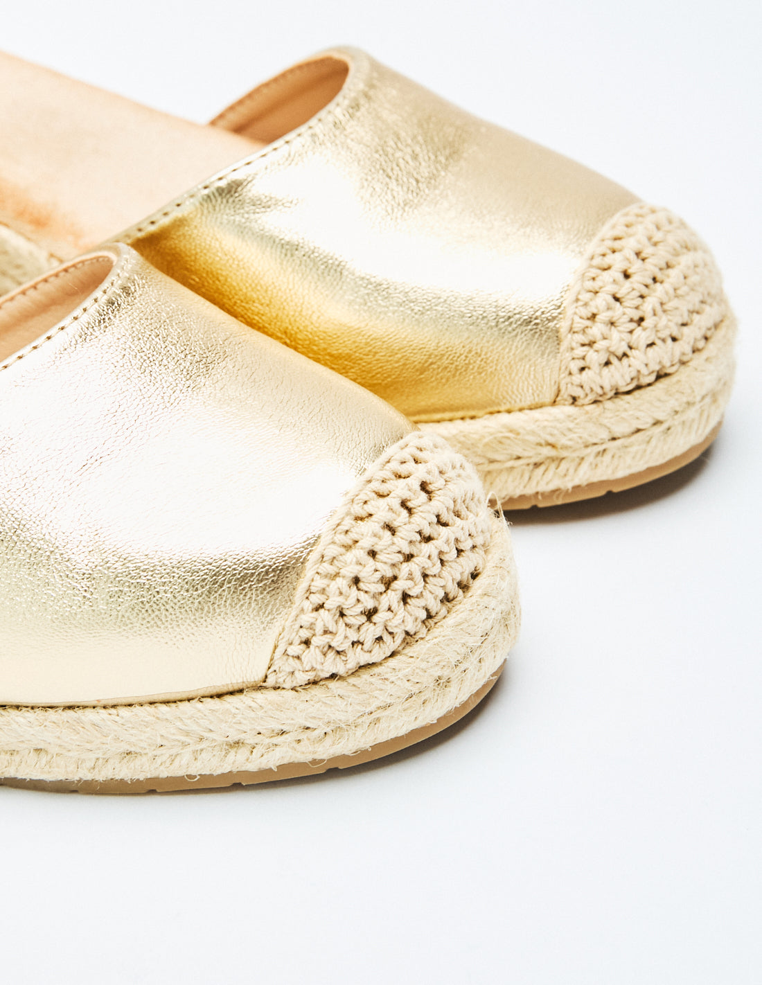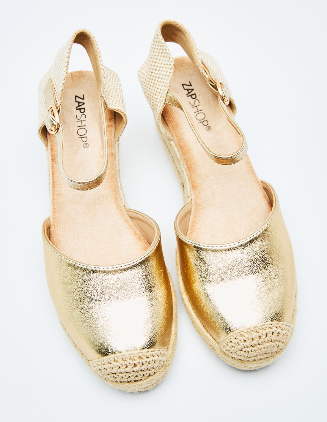 Alpargata destalonada en efecto metalizado . Tacón altura media en forma de cuña. Cierre mediante pulsera con hebilla en el tobillo. Suela de goma con yute . Altura del tacón: 6.8 cm