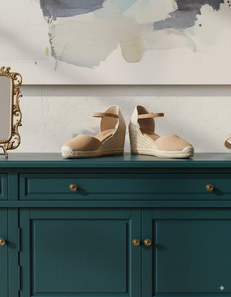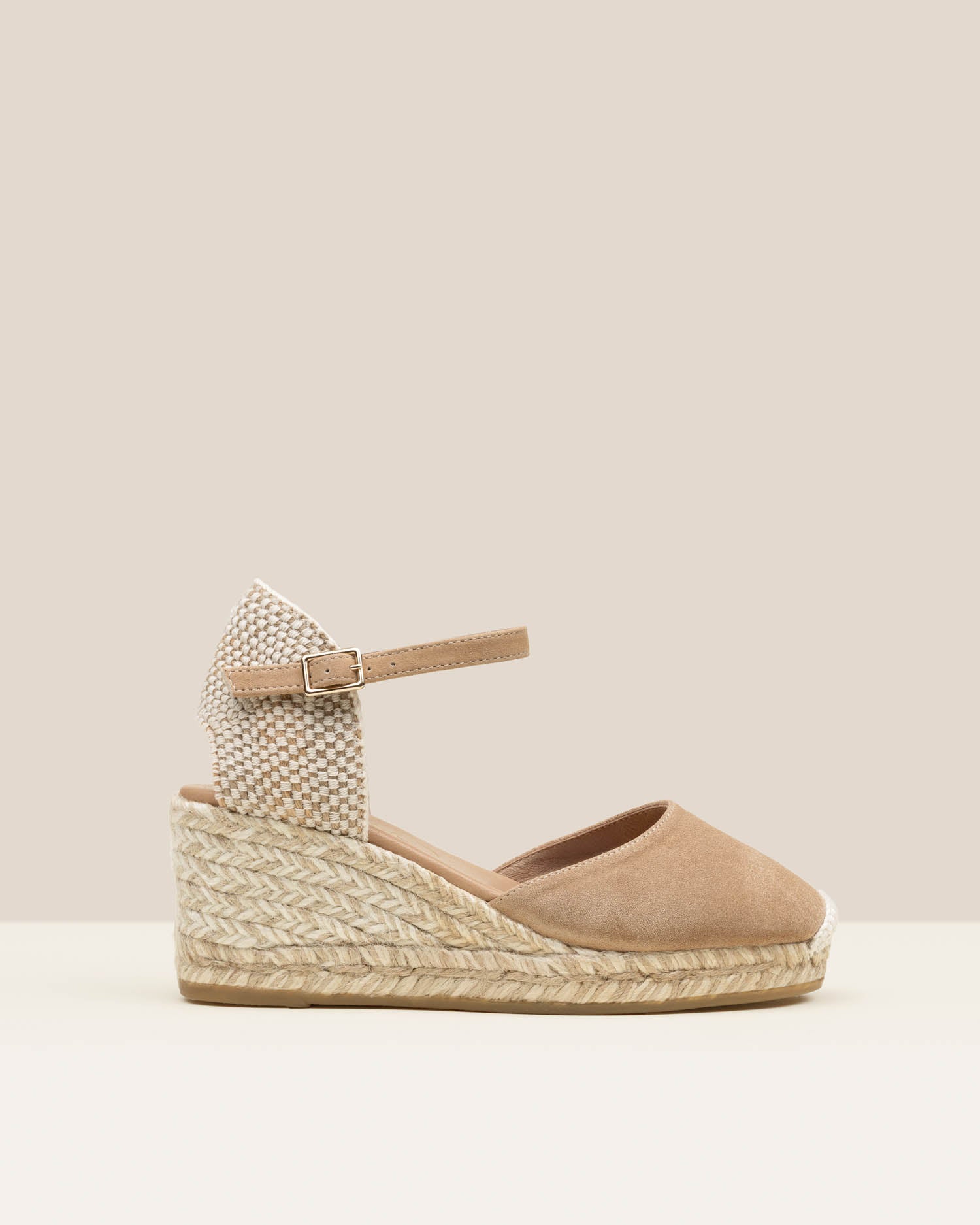 Las alpargatas Robi presentan un diseño elaborado en suave piel de ante, con una cuña de yute bicolor, corte cerrado y talonera con cierre de hebilla al tobillo. Diseñadas y fabricadas artesanalmente con materiales 100% naturales.