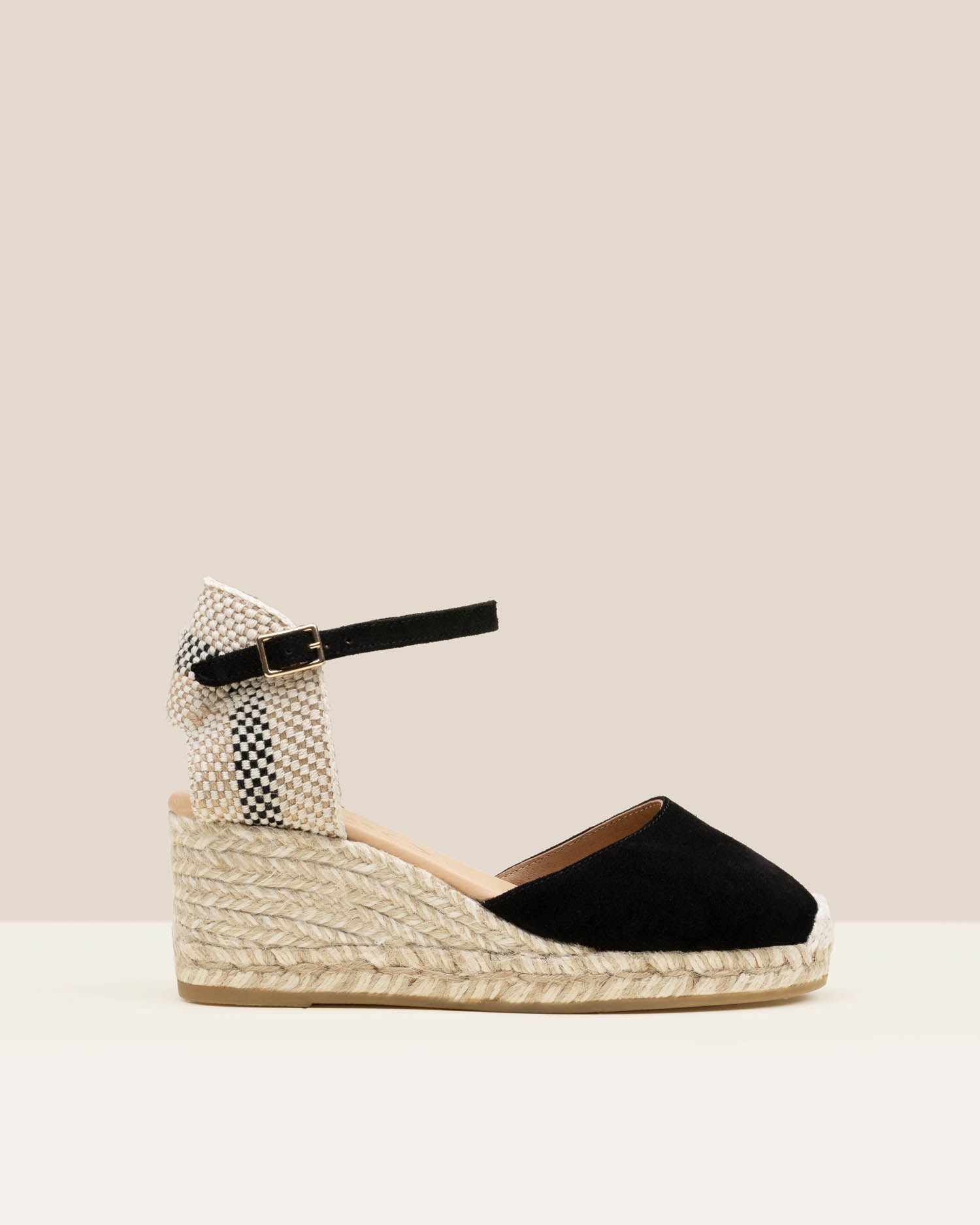 Las alpargatas Robby presentan un diseño elaborado en suave piel de ante, con una cuña de yute bicolor, corte cerrado y talonera con cierre de hebilla al tobillo. Diseñadas y fabricadas artesanalmente con materiales 100% naturales.
