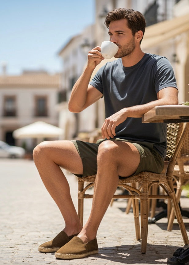 Alpargata de yute plana en serraje para hombre con un elástico en el centro del empeine para más comodidad. Toda la suela está recubierta de una fina capa de caucho para alargar la duración del yute y mejorar la adherencia.
