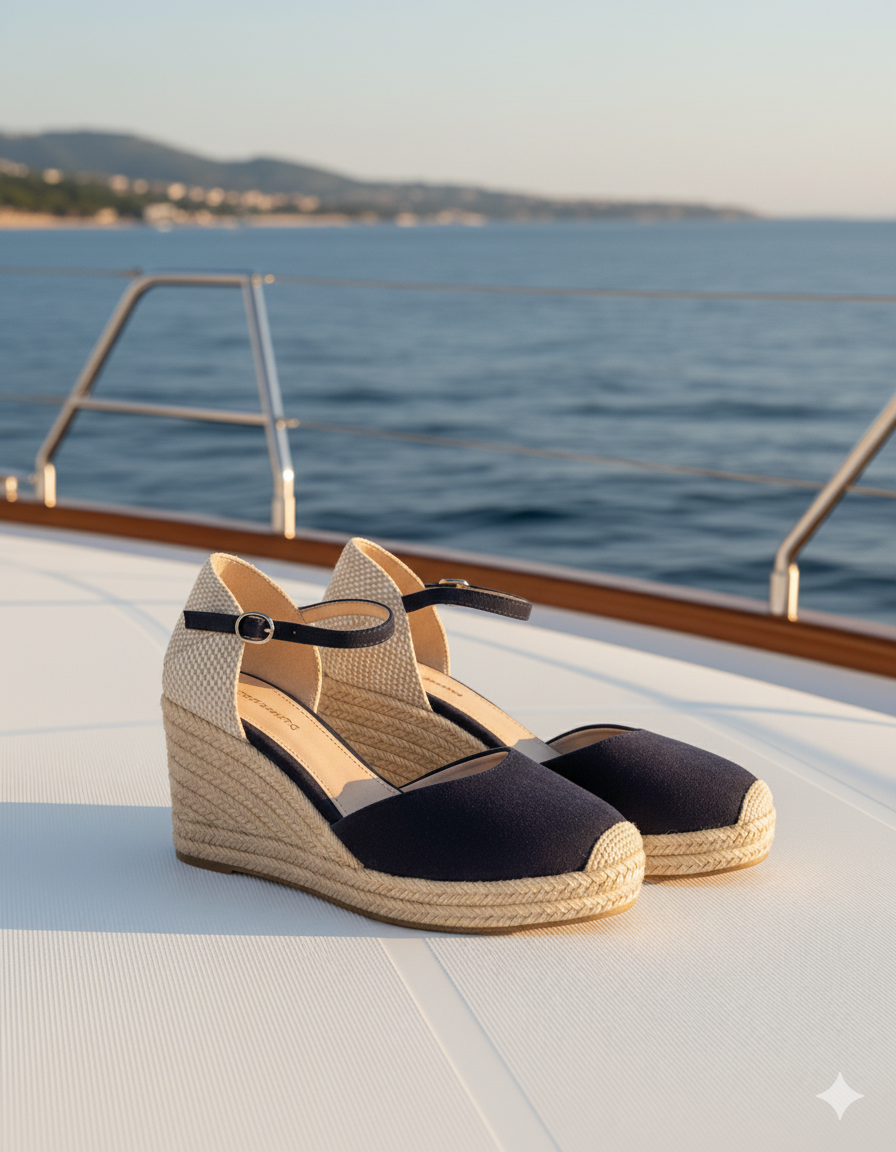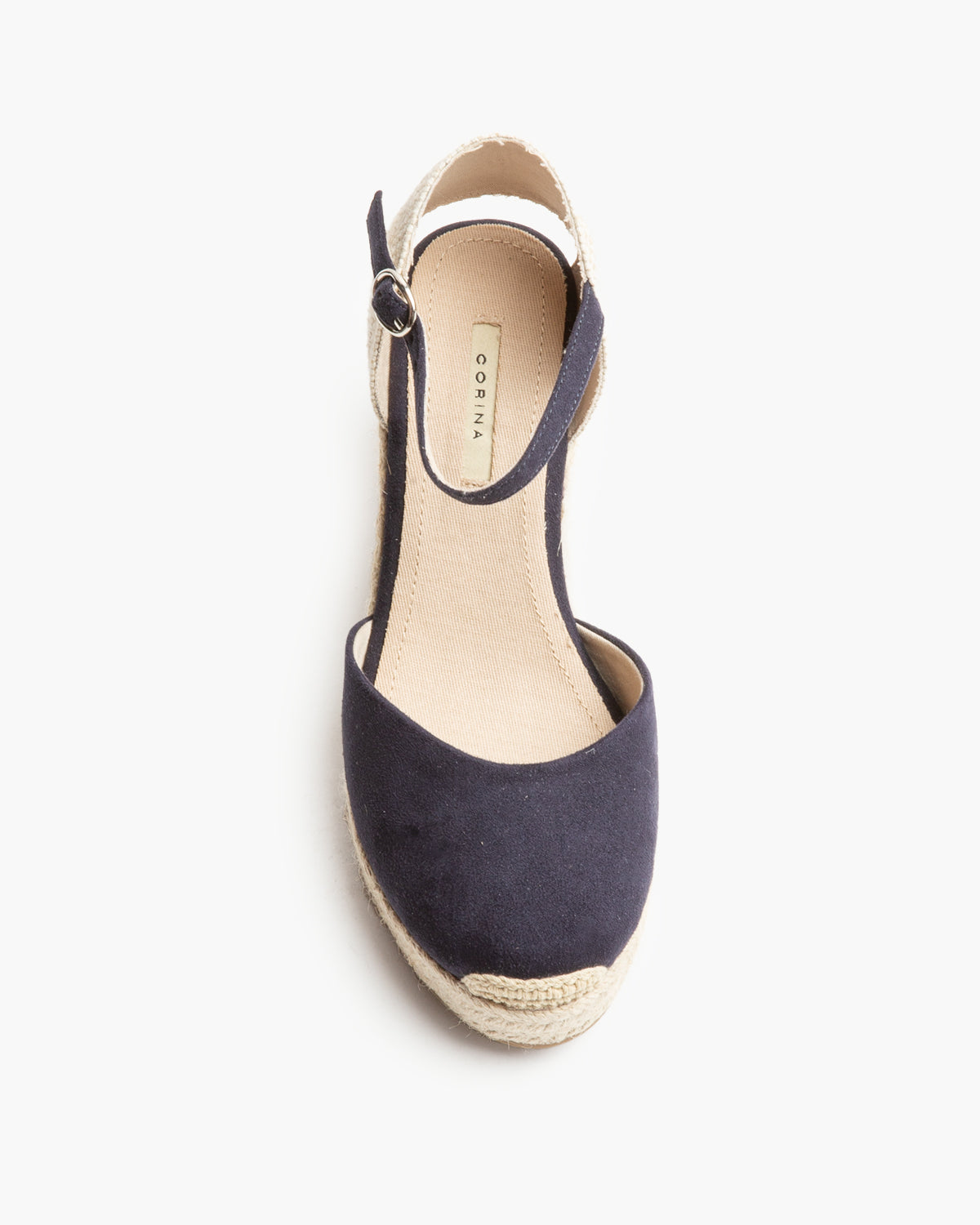 Plataforma tipo valenciana, con cuña en yute. Cierre hebilla en la tira del talón.