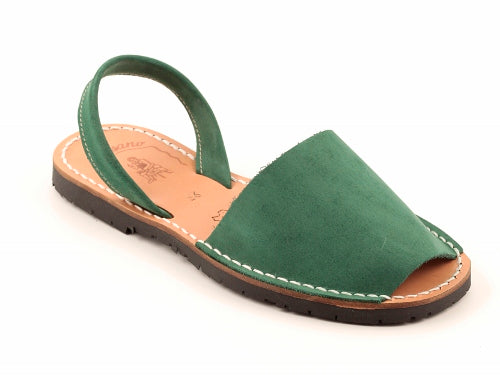 Sandalia ibicenca o menorquina de serraje con plantilla de piel cosida y suela de caucho ultra ligera.