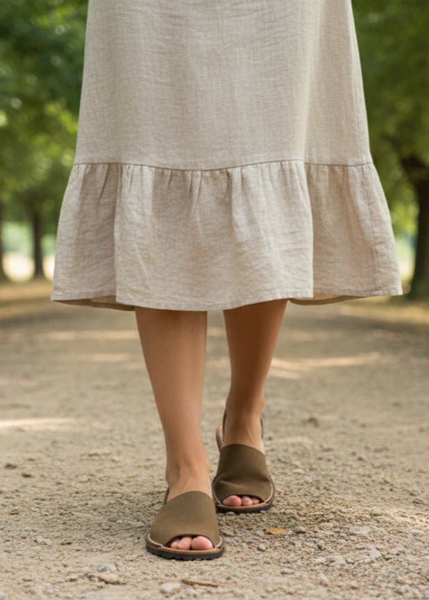 Sandalia ibicenca o menorquina de serraje con plantilla de piel cosida y suela de caucho ultra ligera.