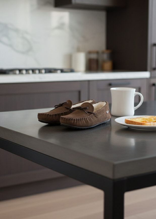 Babucha de serraje tipo mocasín, con suela y forro interior.