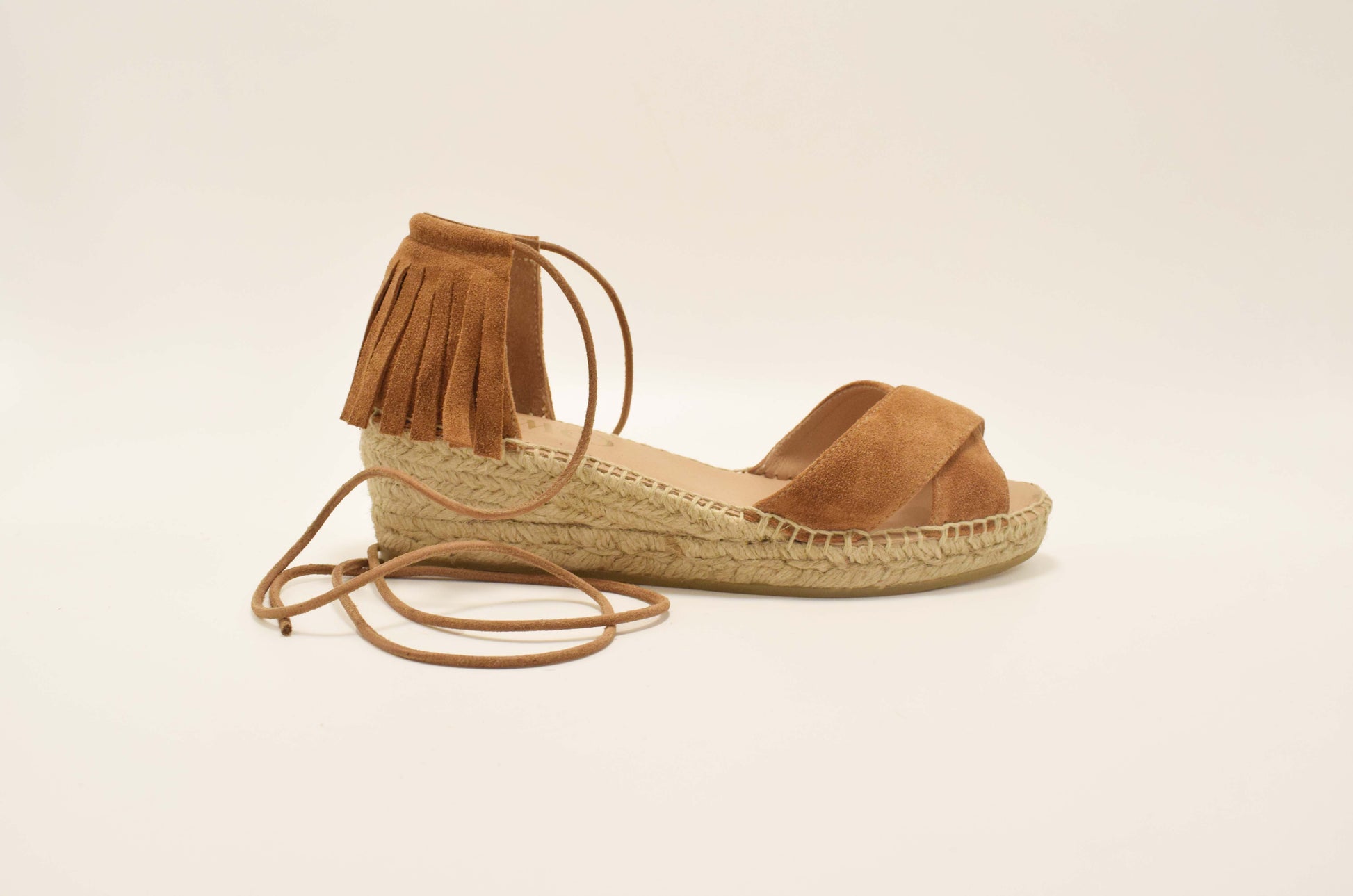 Las alpargatas Coraila son confeccionadas con suave serraje, presentan tiras cruzadas, detalle de flecos en la parte trasera y cintas que se anudan delicadamente al tobillo. Hechas a mano con materiales 100% naturales. Estas cuñas artesanales son el complemento ideal para la primavera y el verano.