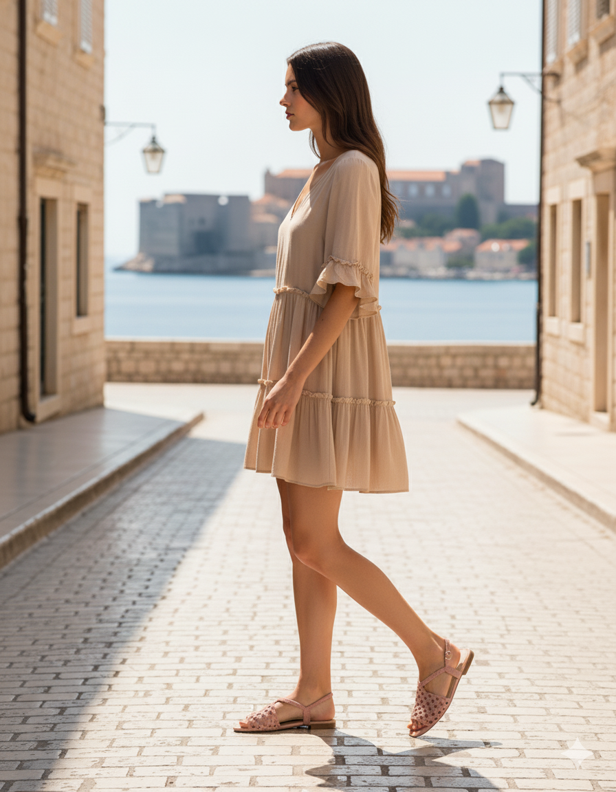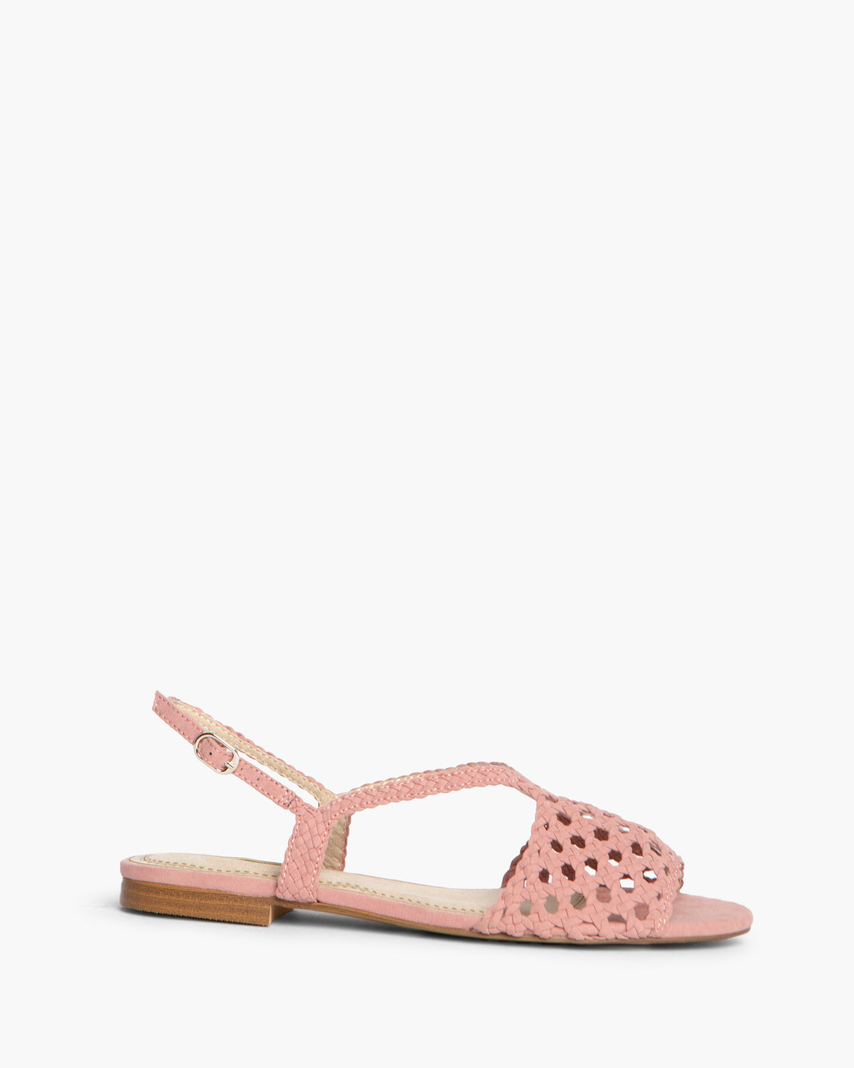 Sandalia plana. Corte trenzado en material tipo ante. Cierre mediante hebilla en la parte lateral exterior.